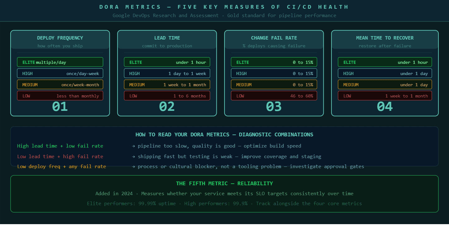 DORA metrics give engineering teams a shared language for discussing CI/CD health and a diagnostic framework for deciding where to invest improvement effort.