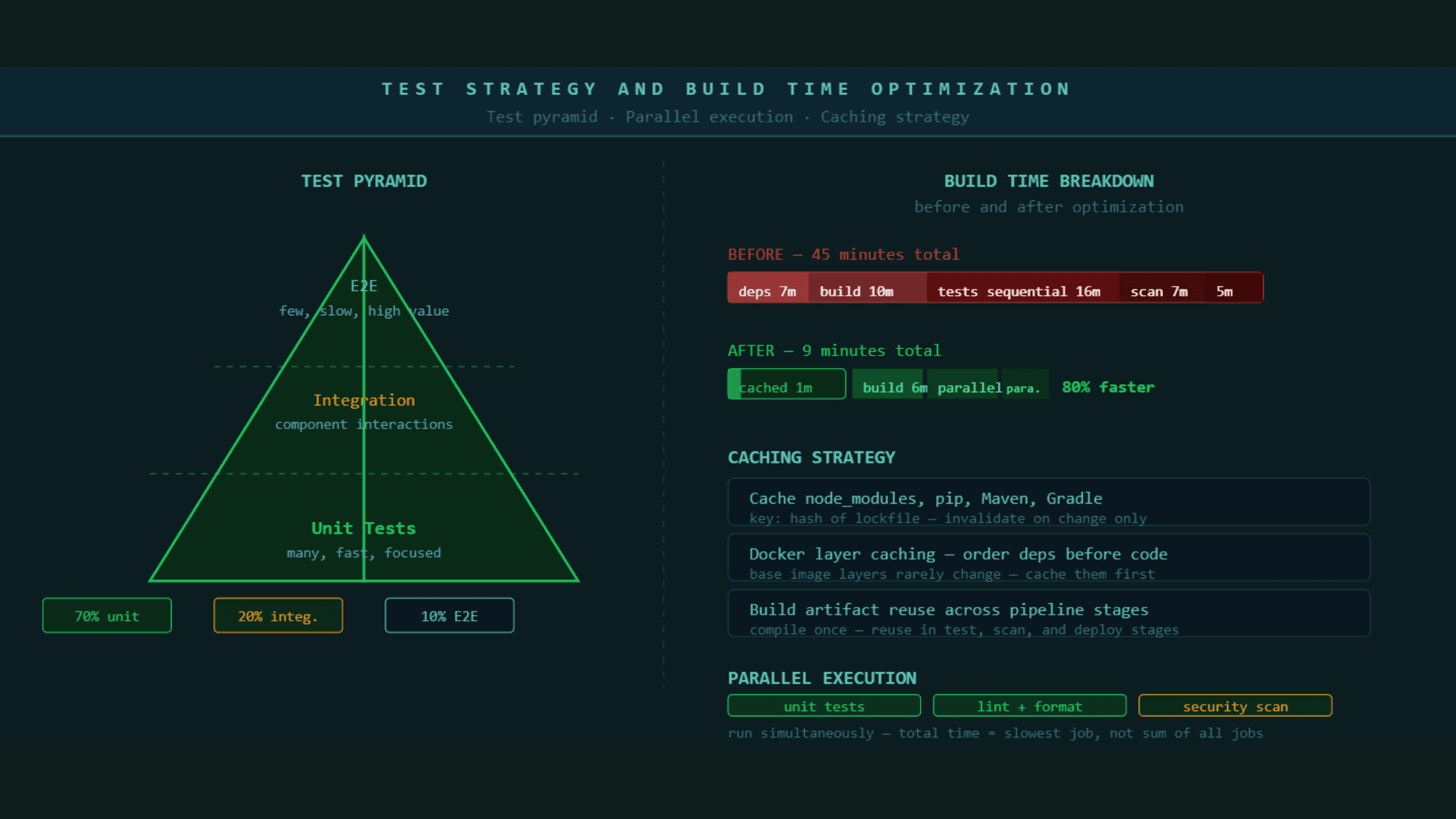 The ten-minute rule is not arbitrary. It is the threshold at which developers stay engaged with a failing build rather than context-switching. Beyond ten minutes, your pipeline is actively slowing your team down every time it runs.
