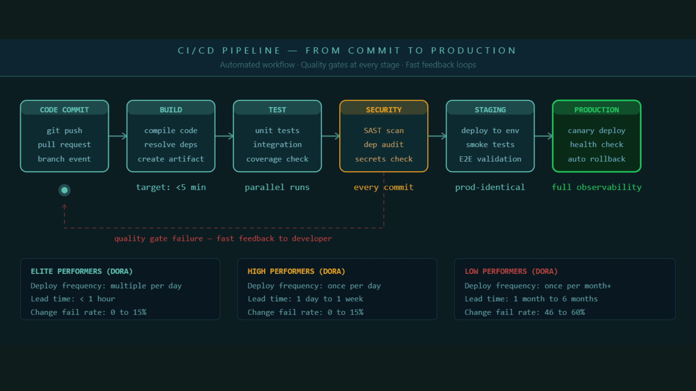 These metrics are not just numbers for reporting to leadership. They are diagnostic tools. A high lead time with a low change failure rate suggests your pipeline is too slow but your quality is good. A low lead time with a high change failure rate suggests you are moving fast but testing is insufficient. Each combination points to a different intervention.