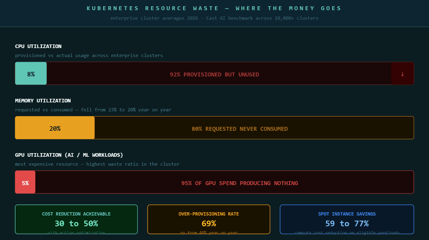 Average CPU utilization across enterprise Kubernetes clusters sits at 8% in 2026, down from 10% the year before. Memory utilization has fallen from 23% to 20%. GPU utilization across AI and machine learning workloads averages 5%. These are not edge cases from teams that are new to Kubernetes. These are averages drawn from tens of thousands of clusters across AWS, Azure, and Google Cloud.