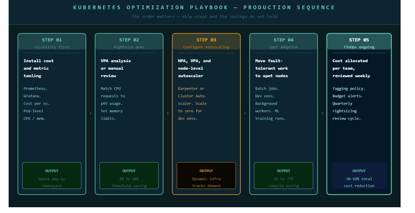 The optimization work follows the five-step sequence: visibility first, then rightsizing, then autoscaling configuration, then spot adoption for eligible workloads, then FinOps governance structures that keep the savings from drifting back. Each step produces measurable results before the next begins, which means every phase of the engagement delivers return before the following phase starts.